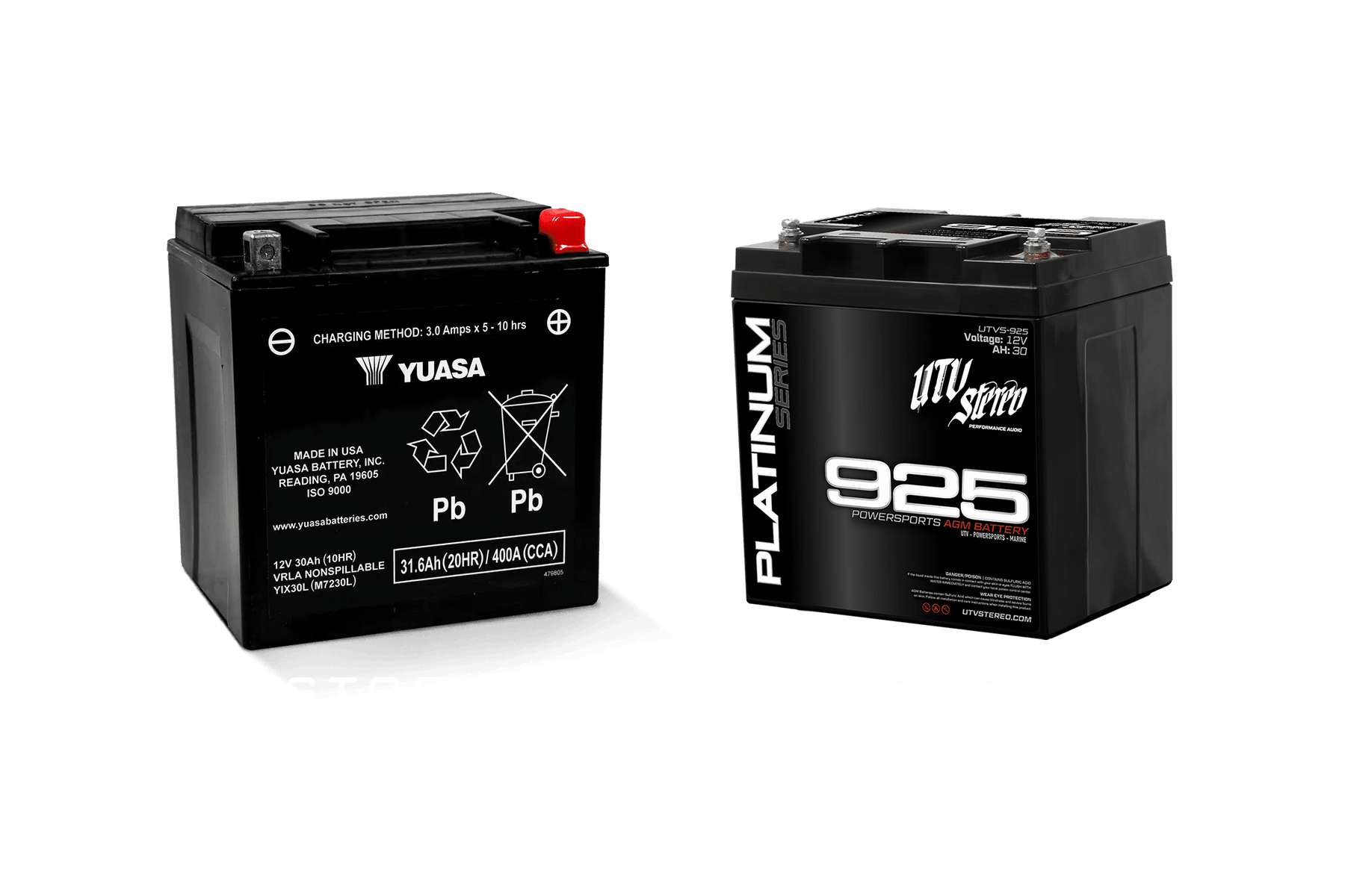 The UTV Stereo Platinum Series Batteries are the longest lasting, most durable AGM (Absorbent Glass Mat) batteries on the market. They are spill proof, vibration & shock resistant, and can be installed in any orientation. Our batteries give you the ability to add aftermarket electronics to your UTV by providing you with more storage capacity and higher power output.