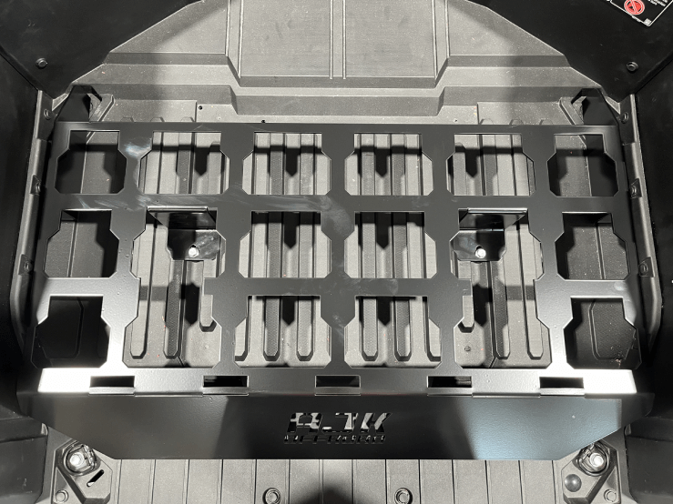 Our Kawasaki KRX Milwaukee Packout Mount is the perfect storage solution and is fully compatible with machines equipped with the factory-installed subwoofer. Each mount is CNC laser-cut in-house from 10-gauge P.O. steel and finished with a durable black powder coat. Installation is simple—using existing bed holes, so no drilling is required. Just remove four bolts, reuse two of them, and replace the other two with the supplied hardware.